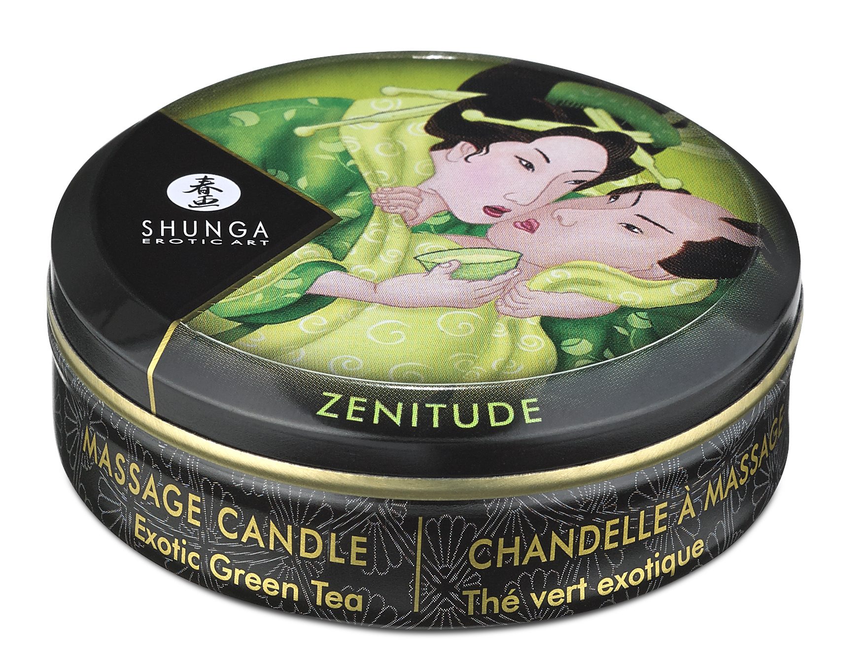 Shunga Erotic Art Mini Massage Candle Exotic Green Tea features 100% natural oils. Produces a lukewarm oil at the touch. Leaves skin soft and silky. Burns for up to 7 hours. Will not clog pores. This soy based candle can be used both as an ambiance candle and intimate massage oil. Enjoy this convenient travel size for your every romantic getaway. Directions: Light the candle and let it burn for about 20 minutes. Extinguish the flame and pour a small quantity in the palm of your hand. Apply freely all over the body for a sensual massage. Ingredients: Ingredients: Hydrogenated Soybean Oil, Coconut Oil, Fragrance, Sweet Almond Oil, Safflower Oil, Avocado Oil, Sesame Oil, Grape Seed Oil, Vitamin E Tocopherol, Benzyl Alcohol, Cinnamyl Alcohol, Citral, Amylcinnamyl Alcohol, Eugenol, Isoeugenol, Benzyl Salicylate, Cinnamal, Coumarin, D-Limonene, Geraniol, Benzyl Cinnamate, Lilial, Linalool, Benzyl Benzoate, Alpha Isomethyl Ionone, Methyl 2-Octynoate, Farnesol.